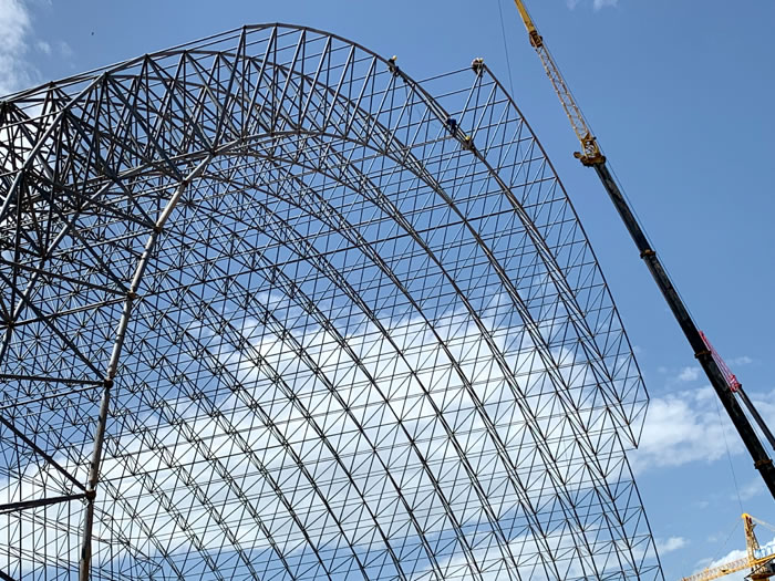 (2)网架加工前应对现场尺寸进行复测,确认无误后方可进行加工、安装;网架制作、运输、安装应遵守《空间网格结构技术规程》JGJ7-2010、《钢网架图们螺栓球节点》JG/T 10-2009、《钢网架图们螺栓球节点用高强度螺栓》 GB/T 16939-2016、《图们钢结构图们工程图们施工规范》 GB50755-2012、《图们钢结构图们工程图们施工质量验收标准》 GB50205-2020。